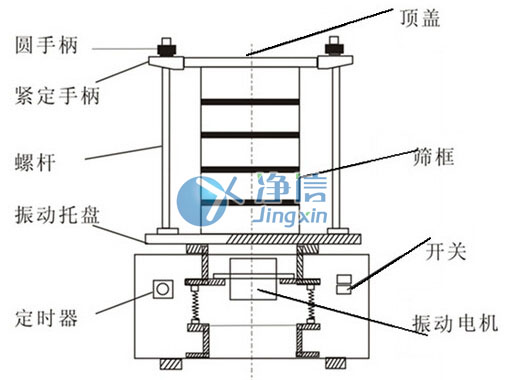 三、把被檢物料放入最上端的標準篩具里,(或蓋上標準篩具上蓋)然后用套在絲柱上的篩分頭壓住標準篩具,旋緊絲柱上的螺母來壓緊標準篩具。(注意:兩側(cè)要用力一致,然后用鎖定螺絲鎖緊。)